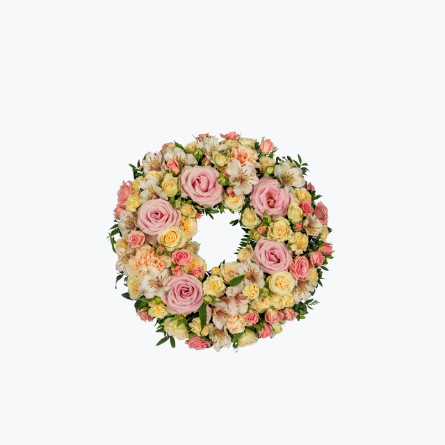 En skjønn liten blomstrende krans: delikat og vakker. Passer fint i de tilfeller hvor man skal sende en enkel båredekorasjon men ønsker noe utenom det vanlige er dette et godt alternativ. Vennskapskransen er betydelig mindre enn de tradisjonelle kransene, men har den samme fine symbolikken: ingen begynnelse - ingen slutt.