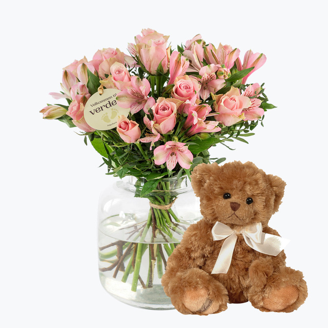 En harmonisk bukett som består av klassiske roser og alstromeria i rosatoner. En vakker hilsen med budskapet velkommen til verden som er passende å sende i forbindelse med en famileforøkelse! Leveres med vår myke Florabjørn.